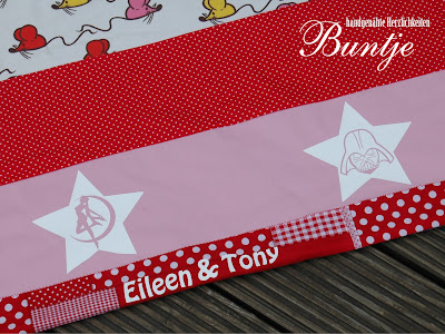 Alle Decken kann ich natürlich auf Sonderwunsch auch noch stärker personalisieren. Bei dieser Decke sollte neben dem Namen auch noch Sterne mit den Lieblings-TV-Charakteren der Eltern (Sailor Moon & Darth Vader) und auch noch der Name der Schenkenden mit verewigt werden.